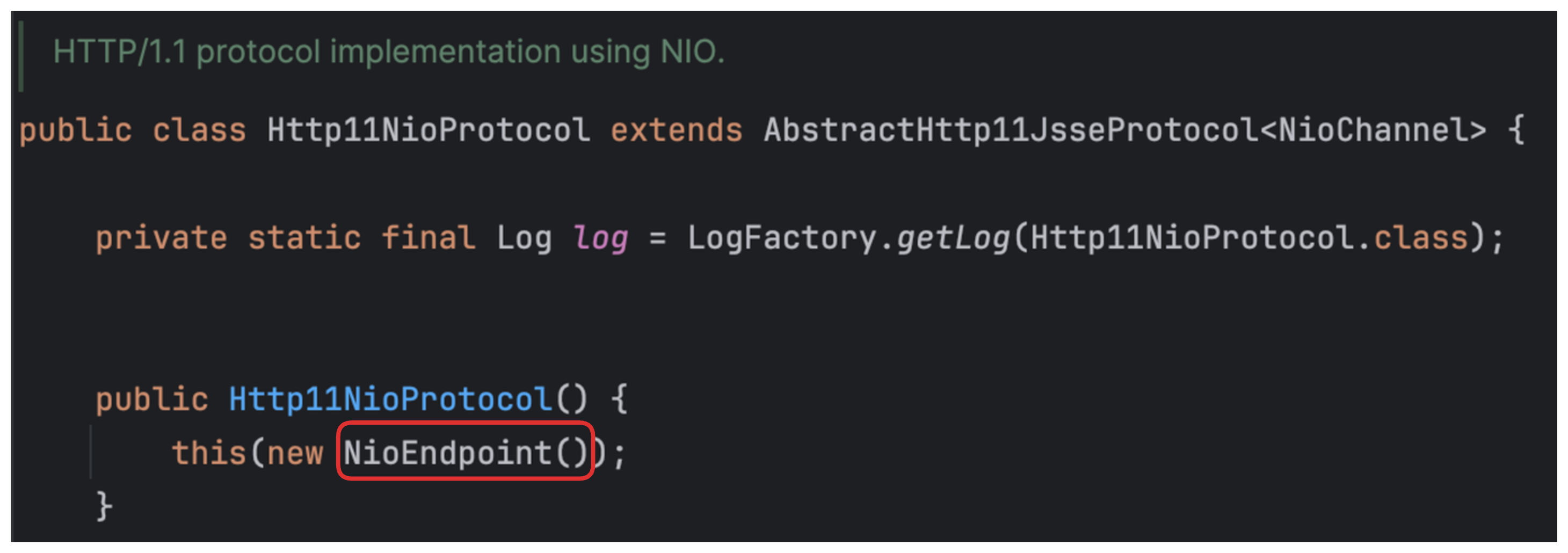 이때 EndPoint 가 무엇으로 정의되어 있는지가 중요합니다. SpringBoot 는 이미 어떠한 앤드포인트를 쓸지 디폴트 정의를 해두었습니다. org.springframework.boot.web.embedded.tomcat 의 TomcatServletWebServerFactory 클래스를 확인해보면 Http11NioProtocol 를 디폴트 프로토콜로 사용함을 확인할 수 있습니다. 그리고 Http11NioProtocol 클래스는 내부적으로 NioEndPoint 를 주입받아 사용하기 때문에 우리는 이제 NioEndPoint 클래스를 중점적으로 보면 됩니다.