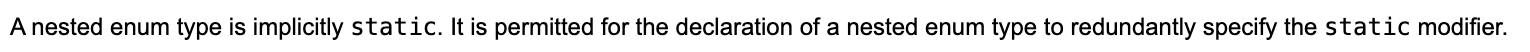 inner 클래스는 static 를 선언해야 하는데 enum도 static 선언을 해줘야 하는지에 대해 공식 문서에 언급된 내용이 있습니다. 원래도 암묵적으로 static이기 때문에 굳이 다시 붙일 이유는 없다고 하네요.