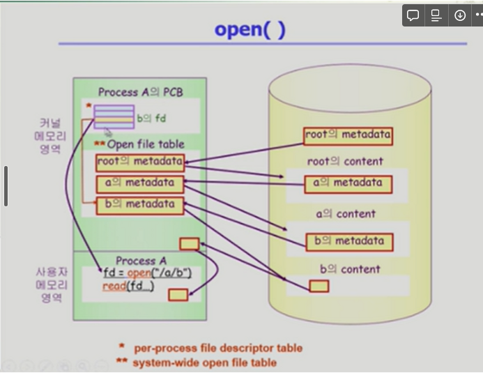 6. open() 의 결과로 b의 파일 디스크립터 (fd) 가 반환된다. 파일 디스크립터는 b의 메타데이터 위치를 가리키는 포인터로 프로세스 A의 PCB에 파일 디스크립터가 저장된다.