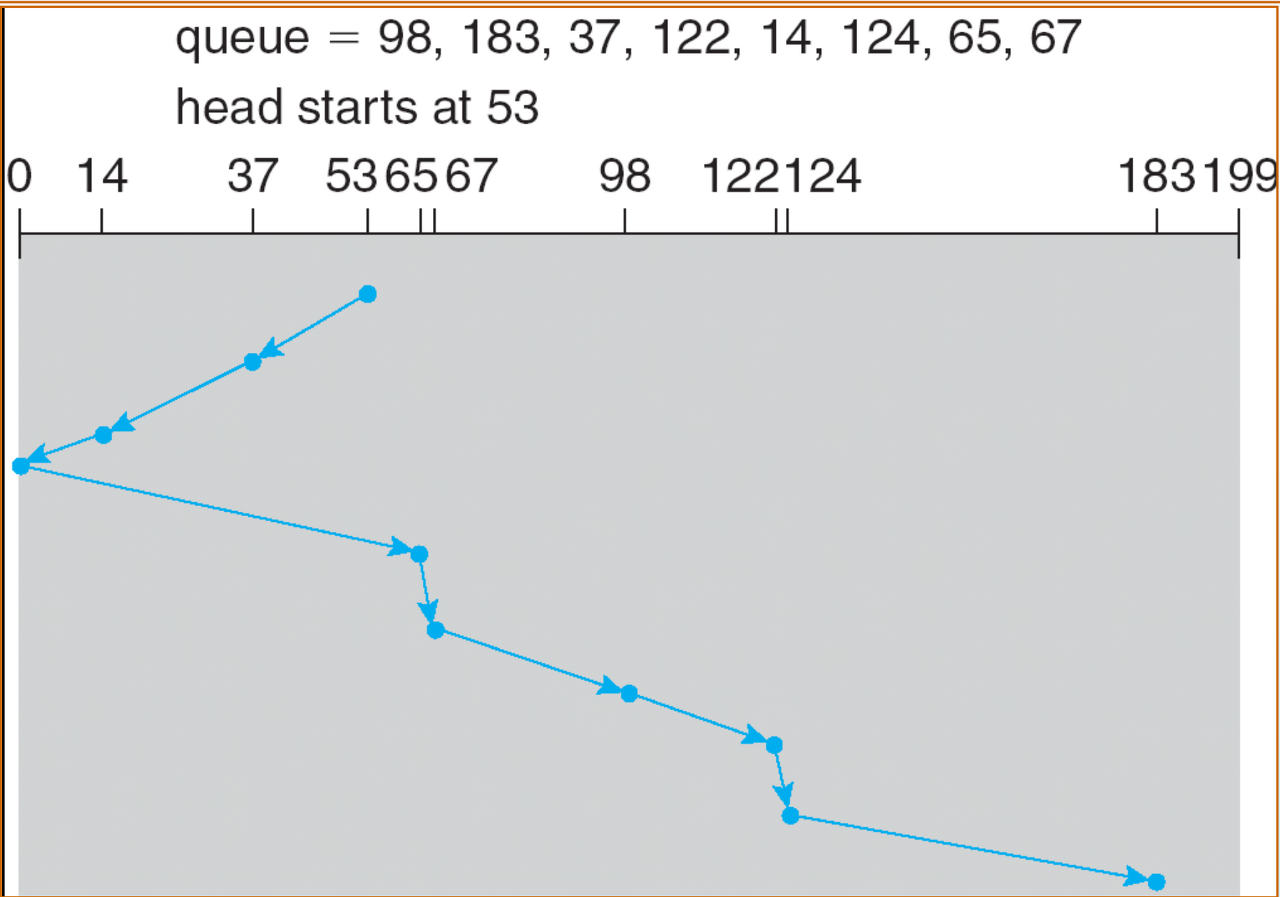 - Starvation 문제 발생 - 현재의 헤드 위치로부터 가까운 곳에서 지속적인 요청이 들어온다면 멀리 떨어진 곳의 요청은 무한히 기다려야한다