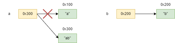 - 새로운 메모리 공간에 "ab" 가 저장된다. (그림에서는 주소 0x300)