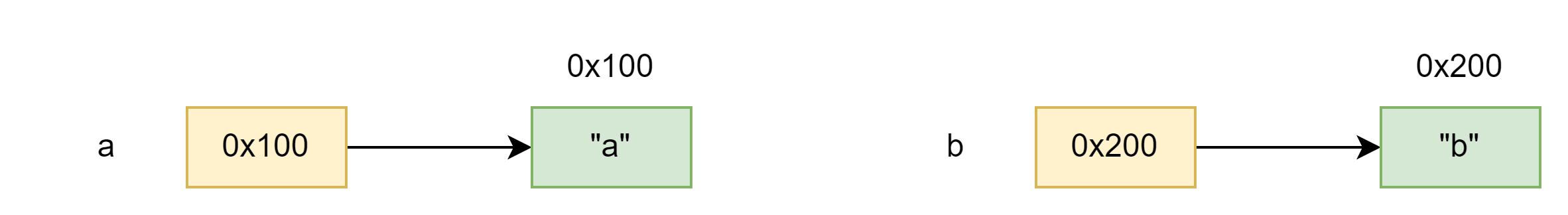 a, b 모두 클래스이기 때문에 변수 자체에는 주소값이 저장되어 있다. 해당 주소값에 가보면 문자열 데이터가 저장되어 있다.
