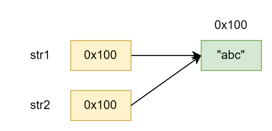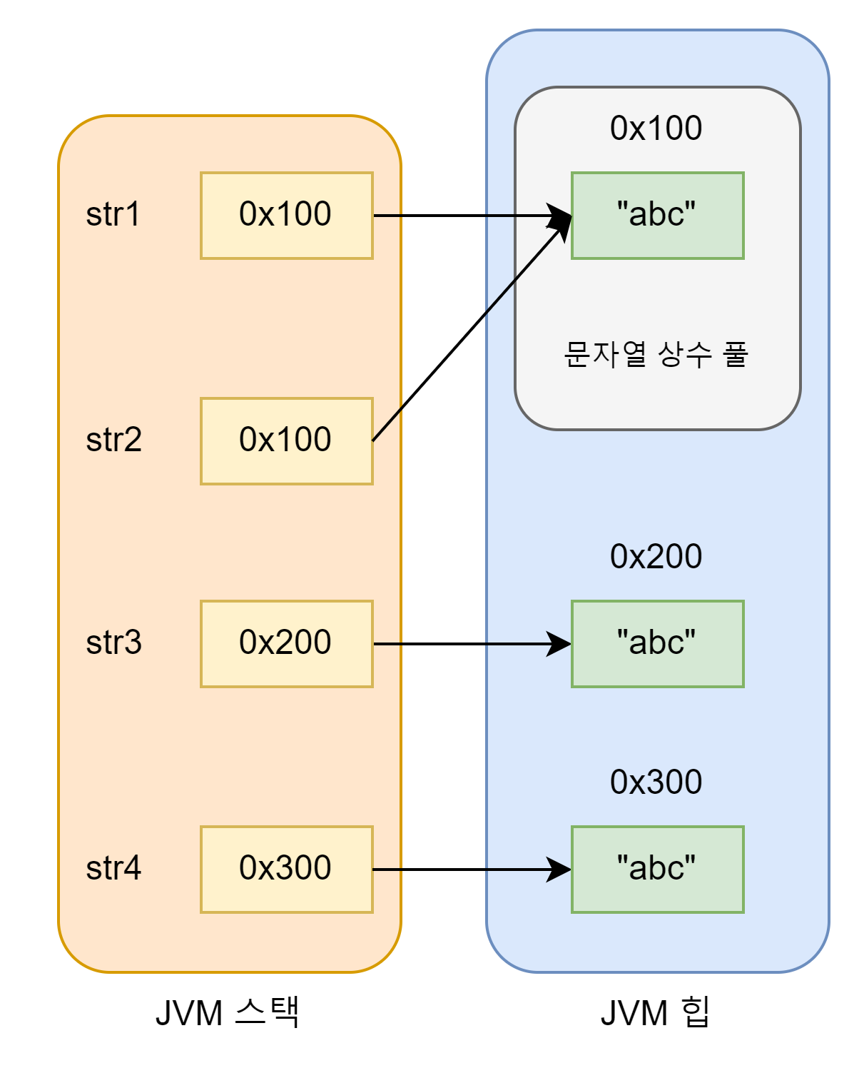 문자열 리터럴은 클래스가 메모리에 로드될 때 자동적으로 미리 생성된다. 따라서 "abc" 가 자동적으로 미리 생성되고 str1과 str2 모두 같은 주소를 가르킨다. 즉 하나의 String 인스턴스 "abc" 를 여러 변수에서 공유한다.