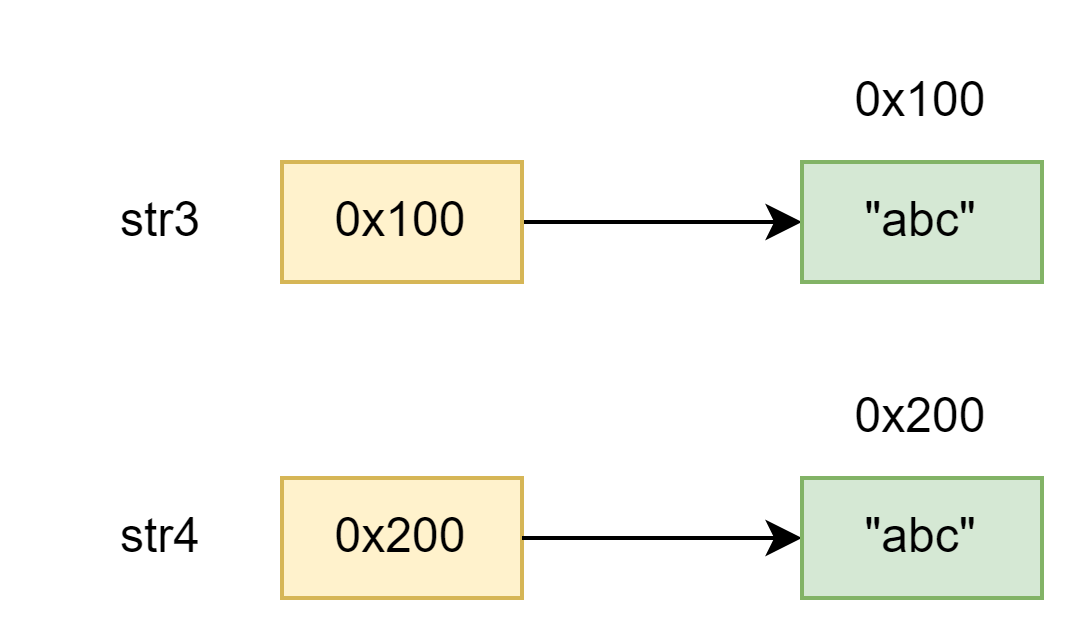 new 를 통해 메모리 할당이 되기 때문에 str3, str4 모두 새로운 인스턴스를 가르킨다.