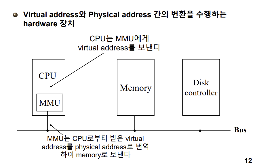 - 프로그램이 실행을 시작한 후에도 물리적 메모리상의 주소가 변경될 수 있는 바인딩 방식이다. 따라서 CPU 는 메모리 접근을 할 때 항상 어디있는지 확인을 해주어야 하는데 이를 돕는게 주소 매핑 테이블이다. 그리고 MMU (Memory Management Unit) 를 통해 하드웨어적 도움을 받기도 한다.