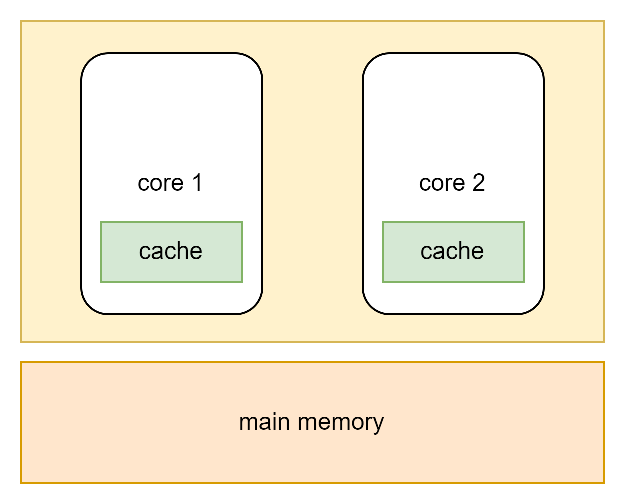volatile 를 알려면 컴퓨터 구조를 알아야한다. 요즘 컴퓨터는 기본적으로 멀티 코어 프로세서를 갖추는데 이때 코어는 메인 메모리에서 데이터를 캐시에 복사해오고 연산을 진행한다. 문제는 캐시와 메인 메모리가 데이터 불일치성이 생길 때 문제가 되는 것이다. 그래서 volatile 로 변수를 선언하면 캐시가 아닌 무조건 메인 메모리에서 읽어오도록 한다.