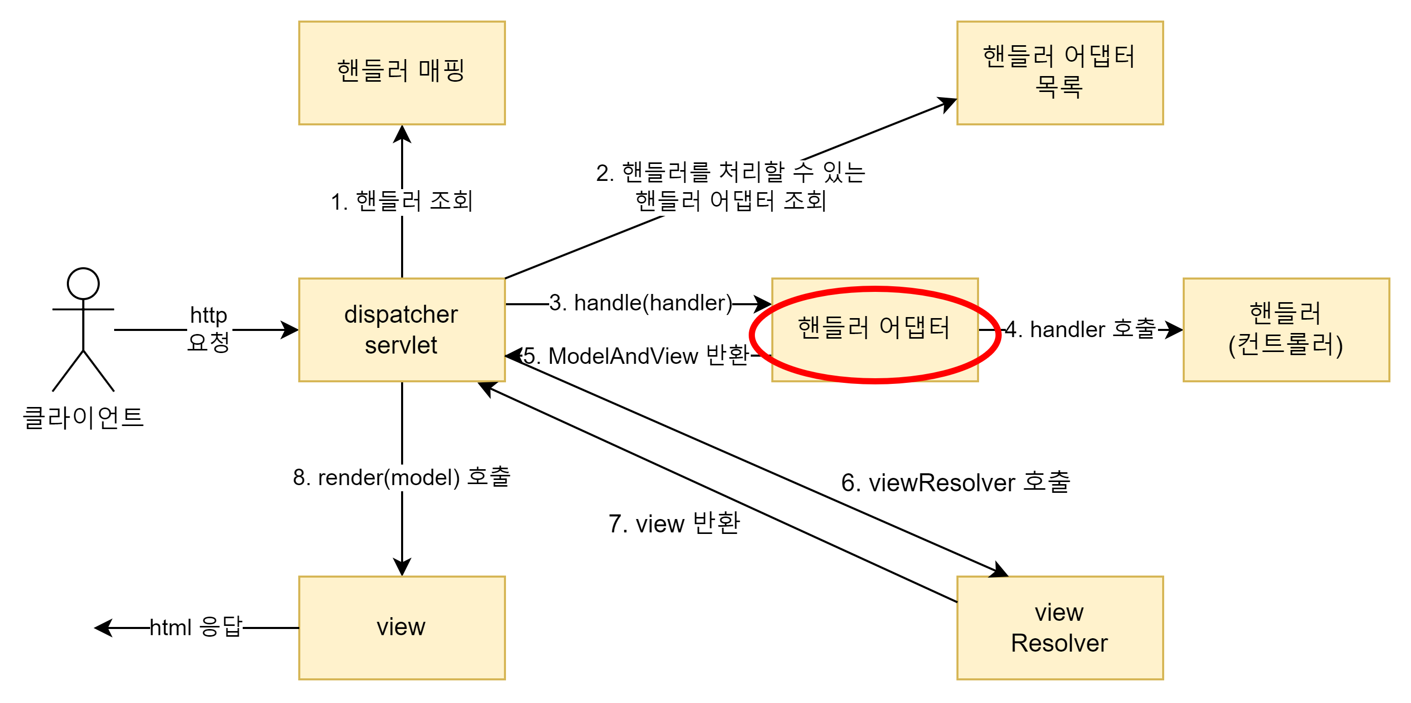 3. HandlerAdapter - handle() 메소드 실행, 4. handler 호출, 5. ModelAndView 반환