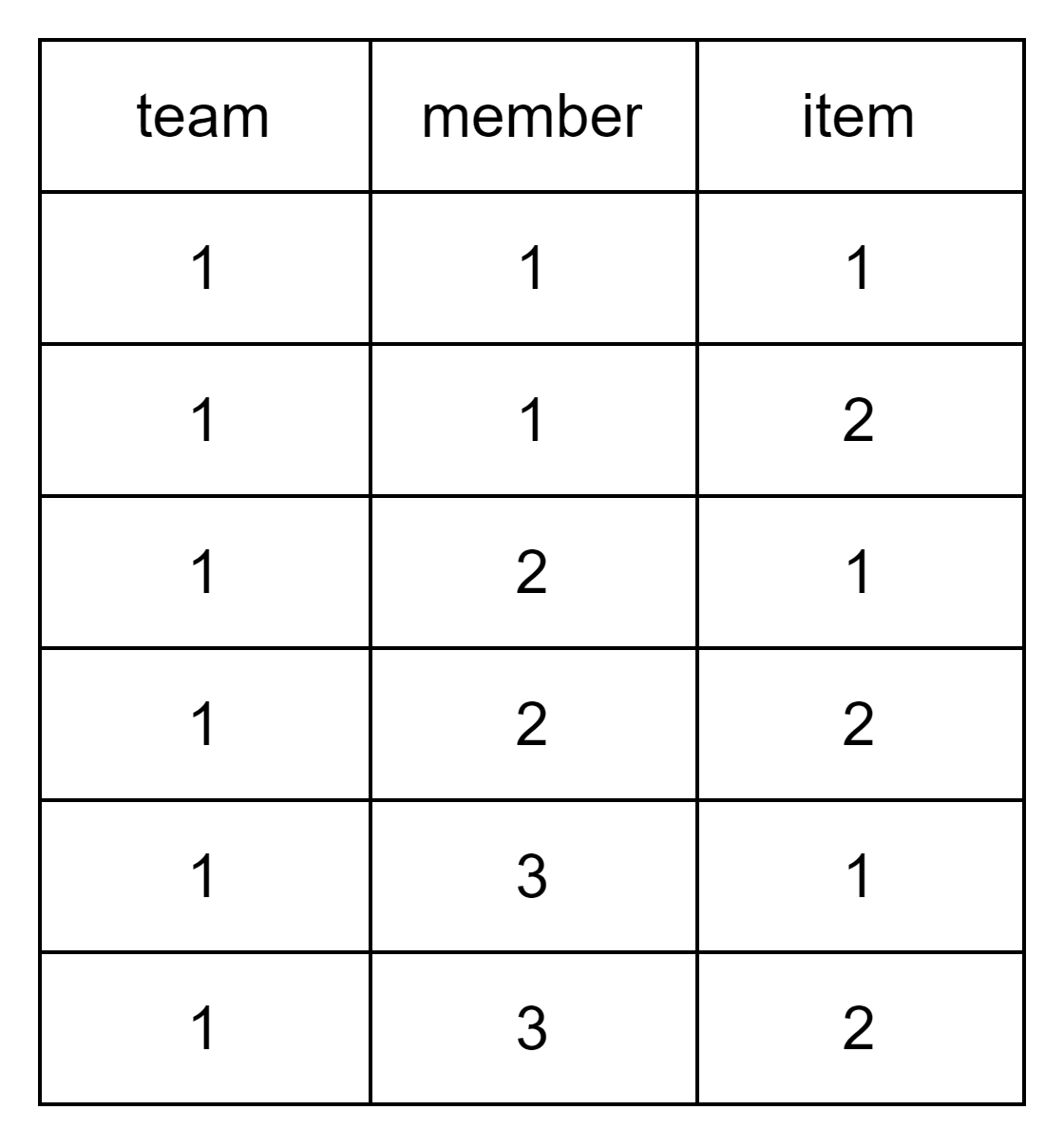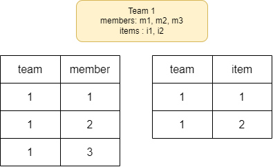 team1 이라는 객체 하나가 여러 개의 member, item를 가지고 있다. 그렇다면 데이터베이스에서는 위와 같을 것이다.