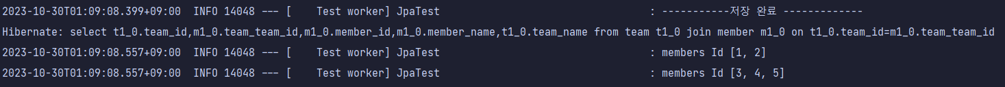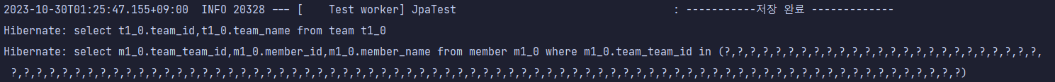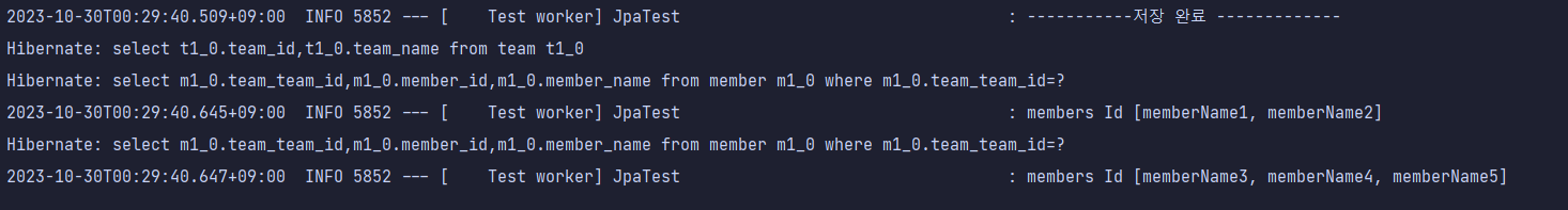 team 만 출력해야 한다면 team table에 해당하는 쿼리만 나가지만 멤버 변수인 members까지 출력하기 위해서는 member 테이블을 조회하는 쿼리가 더 나가야한다. 위의 예제에서는 `select * from member where teamId = 1` 과 `select * from member where teamId = 2` 가 더 나갔다.